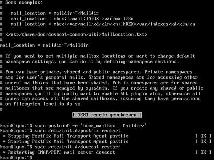 De configuratie van Dovecot vereist nog enkele aanpassingen. Eerst het mailboxformaat: we definiëren dat uw mail in de map Maildir binnen uw gebruikersmap terechtkomt. Open /etc/dovecot/dovecot.conf en voeg de regel mail_location = maildir:~/Maildir toe. Daarna laten we Postfix zijn mails ook hier afleveren met het commando sudo postconf -e 'home_mailbox = Maildir/'. Om onze wijzigingen tot nu toe in de configuratie van beide programma's door te voeren, herstarten we ze met de commando's: