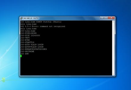 Om te testen of anderen mails naar onze server kunnen sturen, gebruiken we even geen mailclient maar PuTTY. Open PuTTY, vul de domeinnaam van uw mailserver in (voorbeeld.nl), kies als verbindingstype Telnet, als poort 25 en klik op OK. Als u de boodschap 220 voorbeeld.nl ESMTP Postfix (Ubuntu) te zien krijgt, is het een goed teken. Voer nu ehlo voorbeeld.nl in, u krijgt enkele statusregels. Hiertussen moeten zeker de volgende te vinden zijn: 250-STARTTLS, 250-AUTH PLAIN LOGIN, 250-AUTH=PLAIN LOGIN en 250 8BITMIME. Als dit klopt, stop dan de verbinding met het commando quit.