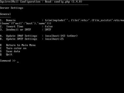 SquirrelMail heeft een eenvoudig configuratiemenu. U start het op met sudo squirrelmail-configure. Hier kunt u menu-opties kiezen door de juiste letters of cijfers in te typen. U kunt de inhoud van het hele menu bekijken, maar gewoonlijk hoeft u bitter weinig aan te passen. Controleer in menu 2 (Server Settings) wel of bij IMAP Settings localhost:143 staat en bij SMTP Settings localhost:25. Keer terug naar het hoofdmenu met R en schakel in menu 4 (General Options) optie 11 (Allow server-side sorting) in door 11 en dan Y in te typen. Sluit af met Q en sla wijzigingen op.