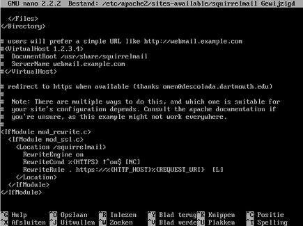 Configureer nu Apache voor SquirrelMail. Kopieer de configuratie van SquirrelMail naar de instellingenmap van Apache: sudo cp /etc/squirrelmail/apache.conf/etc/apache2/sitesavailable/squirrelmail. Open dit bestand met sudo nano /etc/apache2/sites-available/squirrelmail en haal de hekjes (#) voor alle regels vanaf weg om versleuteling via SSL te ondersteunen. Schakel SquirrelMail in met sudo a2ensite squirrelmail, daarna de SSL-module van Apache: sudo a2enmod ssl en de standaardconfiguratie voor SSL: sudo a2ensite default-ssl. In het configuratiebestand /etc/apache2/sites-available/default-ssl vult u het juiste certificaat en de sleutel in. Herstart tot slot Apache met sudo /etc/init.d/apache2 restart.