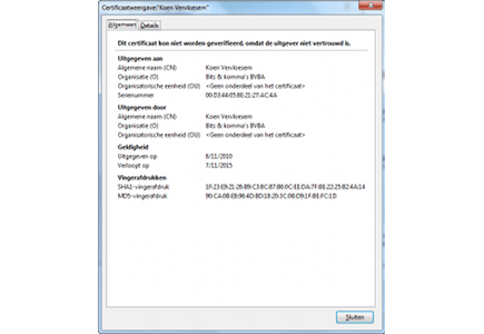 Ook bij de uitgaande server vult u de juiste domeinnaam in en vinkt u de opties voor SSL en verificatie aan. Klik op Volgende. Daarna krijgt u de waarschuwing dat het SSL-certificaat niet door Windows wordt vertrouwd, maar dat komt omdat u het zelf ondertekend hebt. U kunt dus gerust op Ja klikken om toch met de server te verbinden en het certificaat te vertrouwen. Als u daarna uw mail binnenhaalt, moet u uw wachtwoord ingeven indien u dit tijdens het configureren van het account niet hebt laten opslaan.