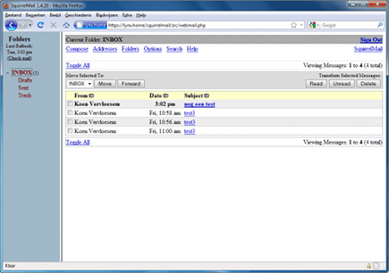 De webinterface van SquirrelMail legt zichzelf wel uit. Wanneer u ingelogd bent, krijgt u uw inbox te zien en kunt u een e-mail lezen door erop te klikken. Bij elke mail hebt u knopjes om op de e-mail te reageren, hem door te sturen of te verwijderen, en er zijn zelfs opties om een printversie of de volledige mailheader van de e-mail te bekijken. Klikt u links op Check mail, dan verschijnen nieuwe e-mails in uw inbox. Naast de inbox hebt u ook folders voor Drafts (concepten), verzonden e-mails en een prullenbak. Klikt u op Compose, dan kunt u een e-mail opstellen.