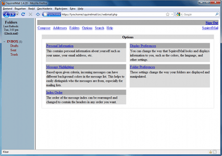 Bij Options kunt u de instellingen van SquirrelMail wijzigen. Onder Personal Information kunt u een handtekening (signature) instellen, en u configureert hier hoe e-mails waarop u antwoordt eruitzien. In Message Highlighting kunt u e-mails die aan bepaalde voorwaarden voldoen in een andere kleur weergeven om ze te laten opvallen, in Index Order geeft u op in welk volgorde en met welke kolommen e-mails in uw inbox getoond worden, in Folder Preferences stelt u het gedrag van mappen in en in Display Preferences is het uiterlijk van de webinterface volledig aan te passen.