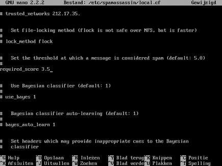 Een goede mailserver kan niet zonder anti-spamoplossing, een goed spamfilter voor Linux is SpamAssassin. Installeer het met sudo apt-get install spamassassin. SpamAssassin geeft alle inkomende e-mails een score van 0 tot 5: hoe hoger, hoe groter de kans dat het spam is. U configureert SpamAssassin in het bestand /etc/spamassassin/local.cf. De belangrijkste optie is required_score, waarmee u aangeeft hoe hoog de score van een e-mail moet zijn voor deze als spam wordt beschouwd. Standaard staat dit op 5, maar 3.5 is een veilige waarde. Verwijder ook het hekje (#) voor de regel.