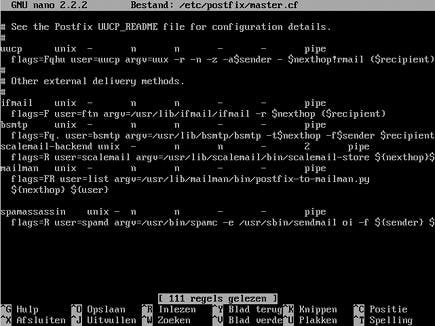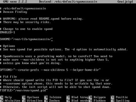 Tot slot maken we Postfix duidelijk dat het SpamAssassin als filter moet gebruiken. Open /etc/postfix/master.cf. Op de regel die begint met smtp inet voegt u aan het einde achter smtpd een spatie en -o content_filter=spamassassin toe. Helemaal aan het einde van het bestand voegt u de regels spamassassin unix - n n - - pipe en flags=R user=spamd argv=/usr/bin/spamc -e /usr/sbin/sendmail -oi -f ${sender} ${recipient} toe. Tot slot maakt u nog de gebruiker spamd en bijbehorende map: sudo groupadd spamd && sudo useradd -g spamd -s /bin/false -d /var/lib/spamassassin spamd && sudo mkdir /var/lib/spamassassin && sudo chown spamd:spamd /var/lib/spamassassin. Herstart daarna Postfix met sudo /etc/init.d/postfix restart.