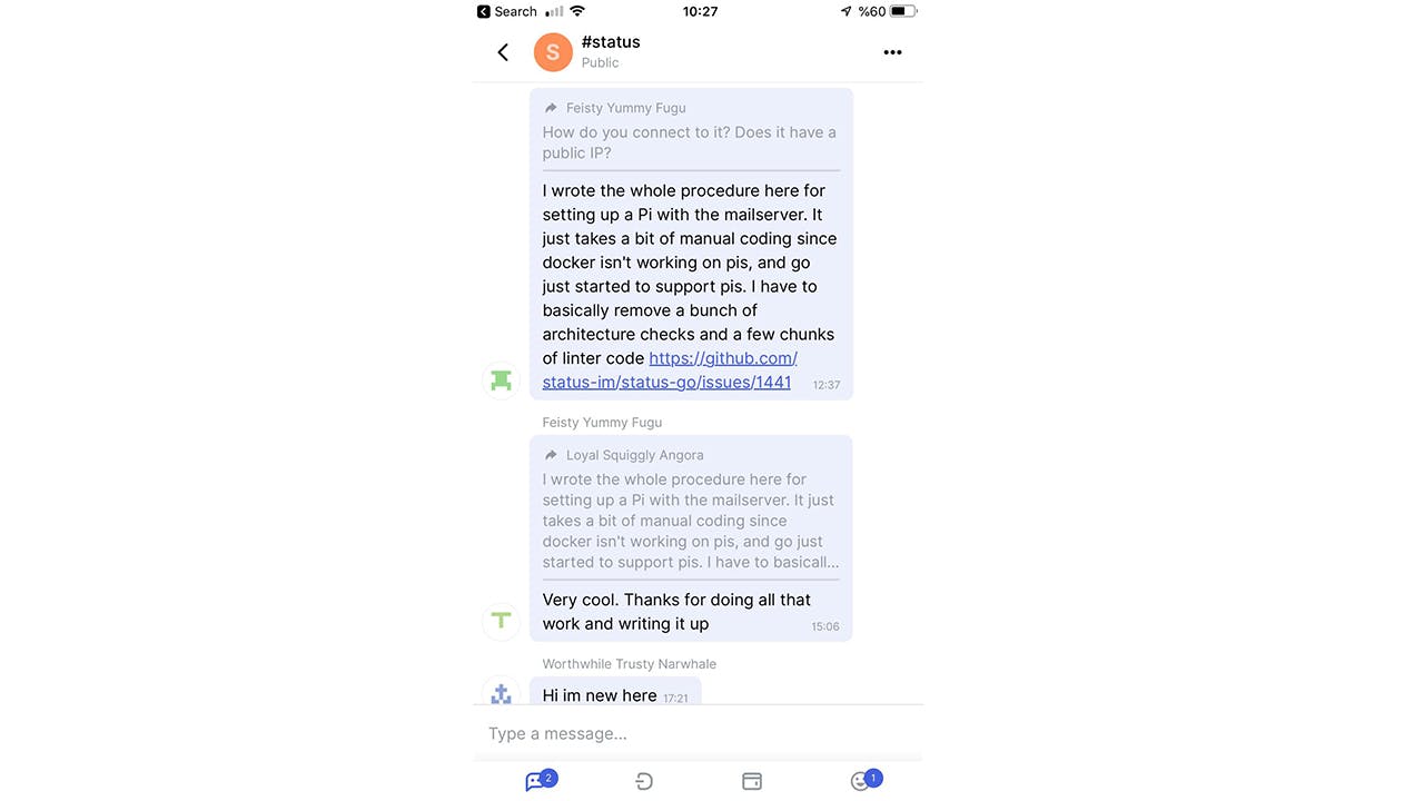 Status Messenger is een chatplatform gebouwd op de Ethereum-blockchain en voorzien van end-to-end-encryptie via het opensource Whisper-protocol. Om de app te gebruiken, moet er binnen de app een cryptovalutaportemonnee worden aangemaakt. Er vindt dus geen koppeling plaats met socialmedia-profielen, telefoonnummers of e-mailadressen. De aangemaakte ‘Ethereum-wallet’ wordt beveiligd met een gebruikersnaam en wachtwoord.