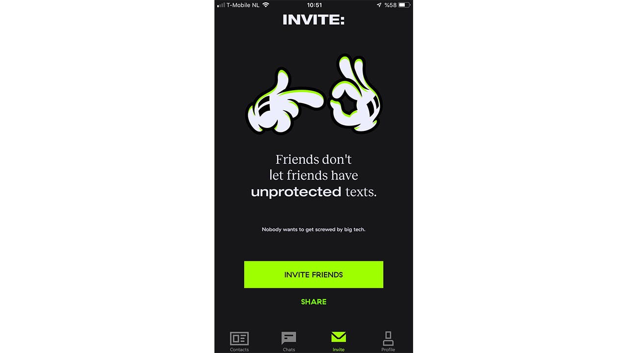 Wickr is een bedrijf dat zich richt op beveiligde gesprekken voor zakelijke doeleinden. Met Wickr Me heeft het ook een gratis optie voor consumenten. Registreren voor Wickr Me kan zonder telefoonnummer, maar de app biedt wel de mogelijkheid om contacten te zoeken op basis van hun telefoonnummers. Wickr claimt hierbij dat telefoonnummers versleuteld worden opgeslagen op hun servers en dat het bedrijf daar geen inzage in heeft. Gelukkig kunnen gebruikers elkaar ook toevoegen op basis van hun gebruikersnaam, waardoor het delen van telefoonnummers niet noodzakelijk is.