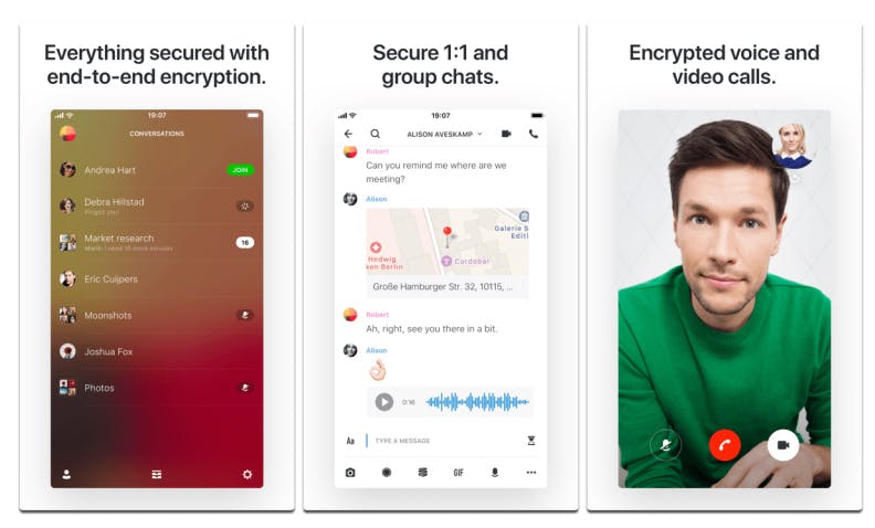 Wire is, net als Wickr, een beveiligd platform gericht op zakelijke groepsgesprekken, maar het kan net zo goed voor privédoeleinden worden gebruikt. De app is voorzien van opensource end-to-end-encryptie bij zowel audio-, video-, als tekstberichten. Daarmee is de veiligheid van Wire gewaarborgd. Deze chatapplicatie biedt allerlei oplossingen om zijn communicatietechnologie te integreren in zakelijke tools, maar voor gewone consumenten is de gratis versie voldoende.