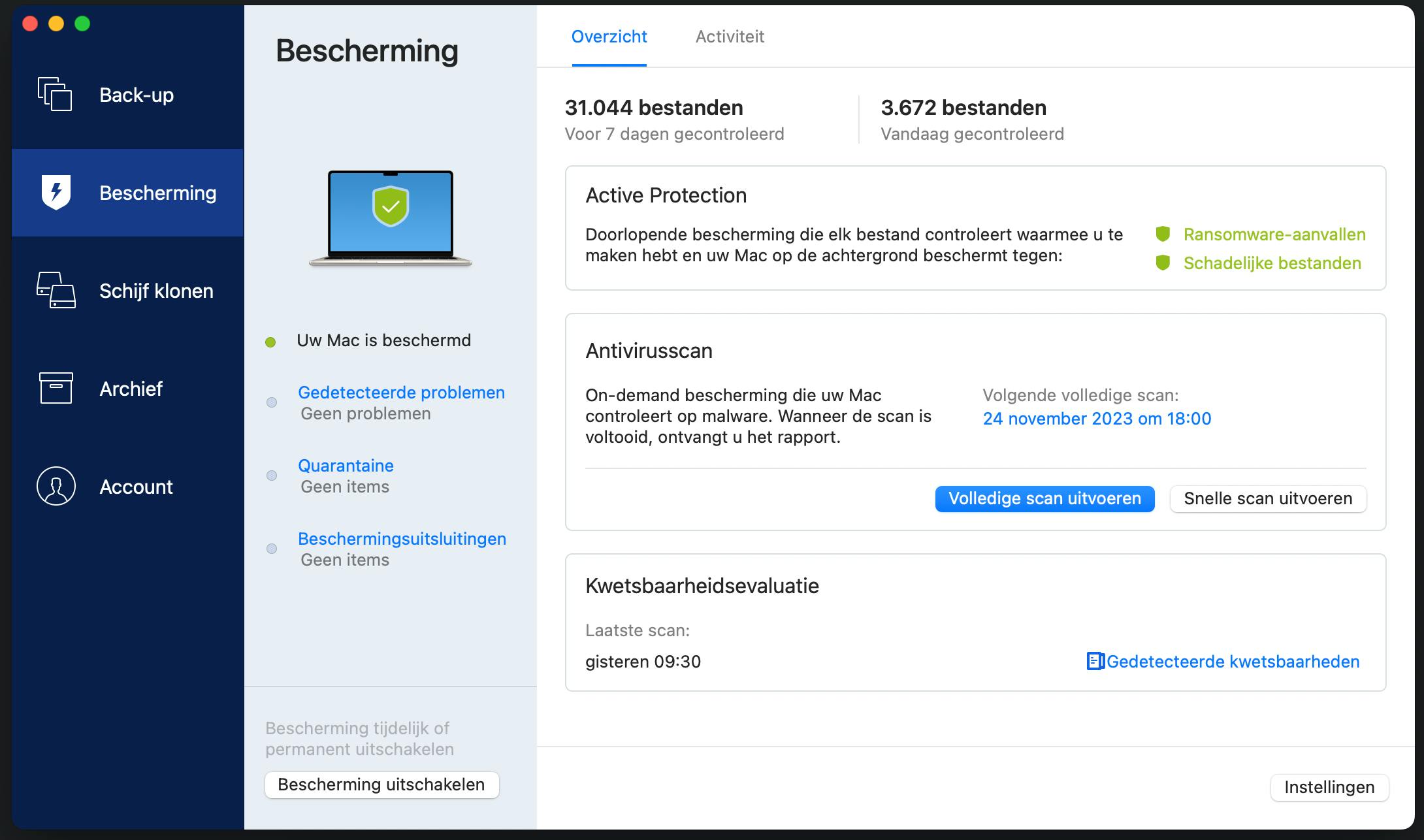 Acronis Cyber Protect Home Office doet precies dat. Als je eenmaal van de 30 of 50 procent kortingsactie gebruikt hebt gemaakt en het programma op je pc, laptop of Mac hebt geïnstalleerd, ben je meteen beschermd. Onder het kopje Bescherming > Activiteiten in de app zie je de resultaten van de eerste scan, die hopelijk geen kwetsbaarheden heeft gedetecteerd. Je kunt via de knop in het scherm ook handmatig een snelle of volledige scan uitvoeren, als je ergens over twijfelt.