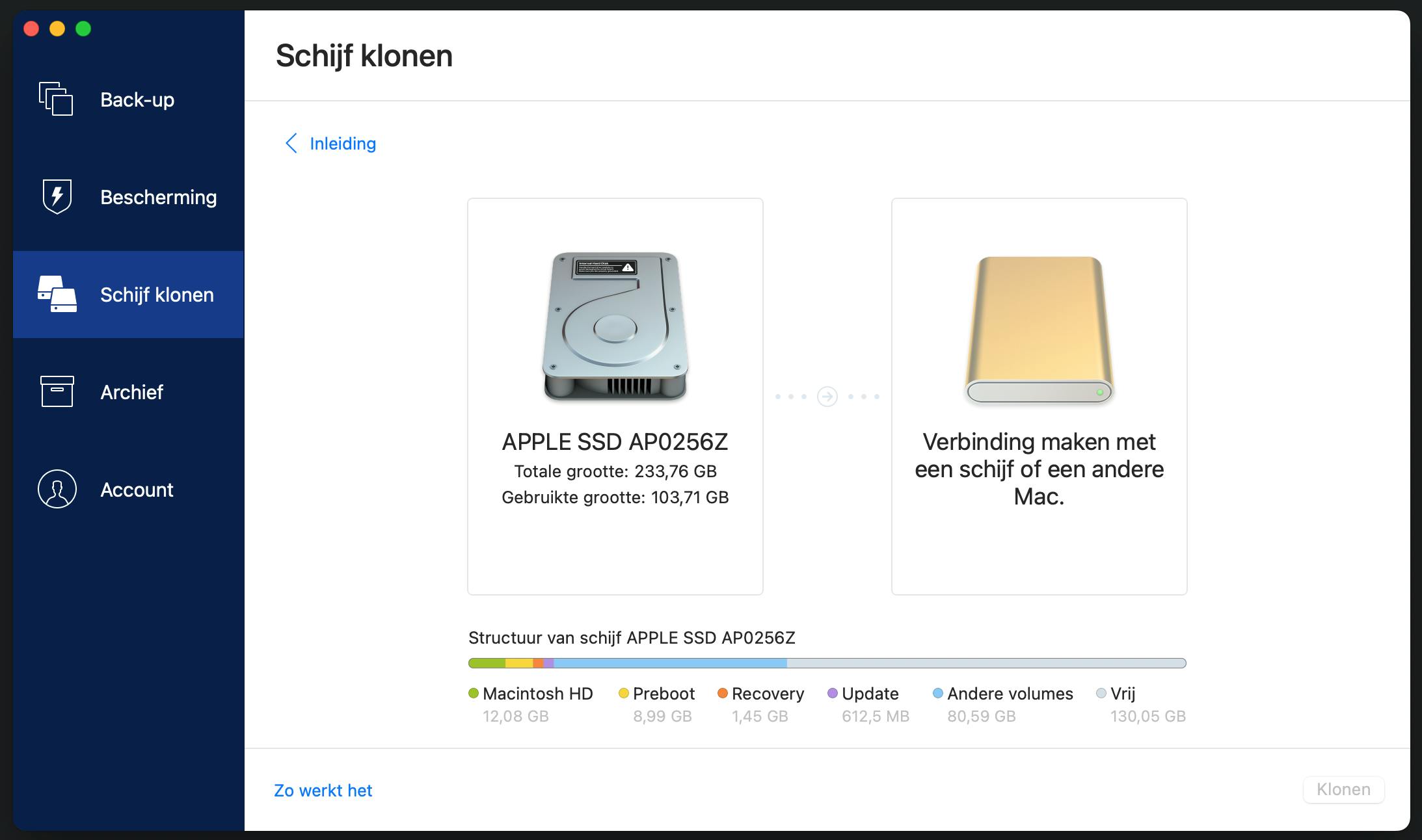 De app stond voorheen bekend als Acronis True Image, waaraan goed valt af te lezen dat dit is waar de app groot mee is geworden. Via de knop Schijf klonen aan de linkerkant kun je het proces beginnen. Het voordeel van het klonen van een volledige schijf is dat alle informatie wordt meegenomen, niet alleen de losse bestanden zelf. Zo kun je met een paar drukken op de knop een volledige schijf overzetten, inclusief het besturingssysteem - handig als je bijvoorbeeld een nieuwe laptop hebt, of als je een back-up van je volledige systeem wil maken op een externe ssd.