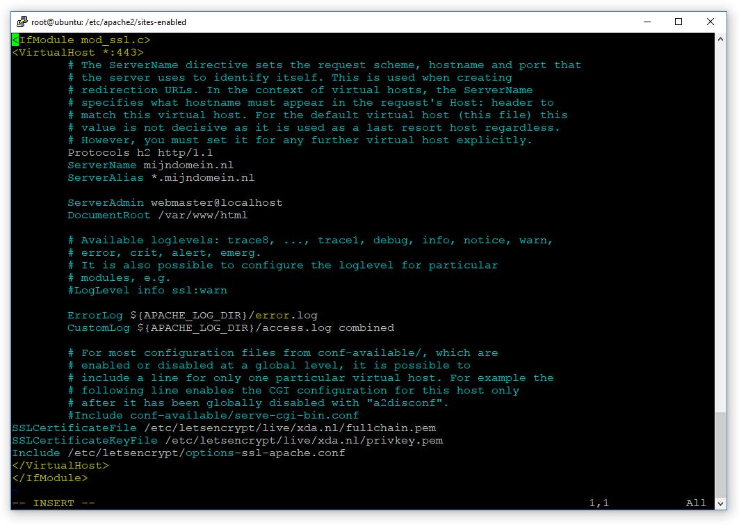 We moeten, in 000-default-le-ssl.conf, alleen nog expliciet http/2 aanzetten voor deze website. Daarvoor voeg je de regel Protocols h2 http/1.1 toe. Het bestand ziet er dan als volgt uit. Herstart Apache na de aanpassing.