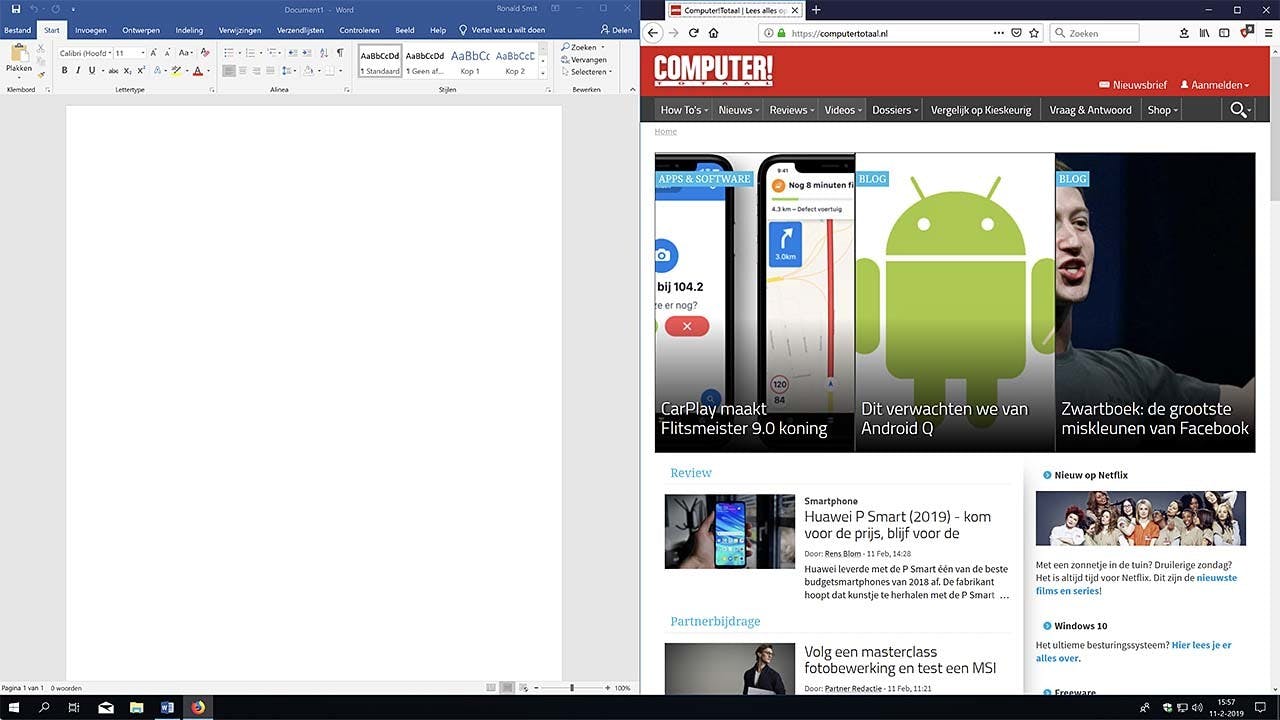 Als je meerdere vensters tegelijk opent kan dat soms tot een wat onoverzichtelijk geheel leiden. Nergens voor nodig, want met diverse handigheidjes voorkom je chaos. Stel dat je bijvoorbeeld een browservenster en een Wordvenster hebt geopend en die wil je op een praktische manier naast elkaar zetten. In dat geval kunt je kiezen voor een soort van split-screen modus. Sleep eerst (bijvoorbeeld) het Wordvenster (via de titelbalk) helemaal naar het midden van de linkerrand van je scherm. Of beter: schuif het een eindje over die rand heen. Je kunt eveneens met het te verdelen venster geactiveerd op de sneltoets Windows-cursor links (of rechts) drukken. Op het moment dat je zo ongeveer minder dan de helft van het venster ziet laat je de muisknop los en vult het venster vervolgens precies de helft van je scherm (horizontaal gezien). Doe hetzelfde met het geopende browservenster, maar nu aan de rechter rand (of wederom via de sneltoets). Vreemd genoeg is ergens bij een van de vele Windows upgrades de mogelijkheid tot het verticaal opdelen van vensters helaas gesneuveld. Wat wel kan is nog meer vensters op deze manier in beeld brengen. Dat doe je door ze in plaats van naar halverwege de rand naar een van de vier hoekpunten van je scherm te slepen. Daarmee 'betegel' je je beeldscherm tot vier even grote vensters. Combineren van een groter venster met twee kleintjes kan ook door gebruik te maken van hoekpunten en een van de randen.