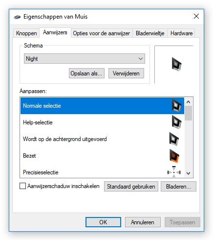 Klik op de eerste keuze onder Aanpassen, Normale selectie, en vervolgens op Bladeren. Zoek de map op waarin je de aanwijzers hebt geplaatst en zoek de juiste aanwijzer (meestal krijgen de aanwijzers dezelfde naam als in de lijst onder Aanpassen, maar dan in het Engels). Je kunt natuurlijk ook zelf kiezen welke aanwijzer je wanneer wil gebruiken.