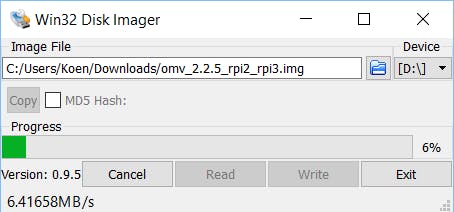 Het gedownloade image is een gecomprimeerd gz-bestand. Pak het uit, bijvoorbeeld met het programma 7-Zip. Open het gz-bestand met 7-Zip en klik op Extract om het img-bestand erin uit te pakken. Steek daarna een microSD-kaart in de kaartlezer van je computer en start het programma Win32DiskImager. Kies de schijfletter van je microSD-kaart, selecteer het img-bestand van OpenMediaVault en klik op Write om het besturingssysteem naar je kaartje te schrijven.