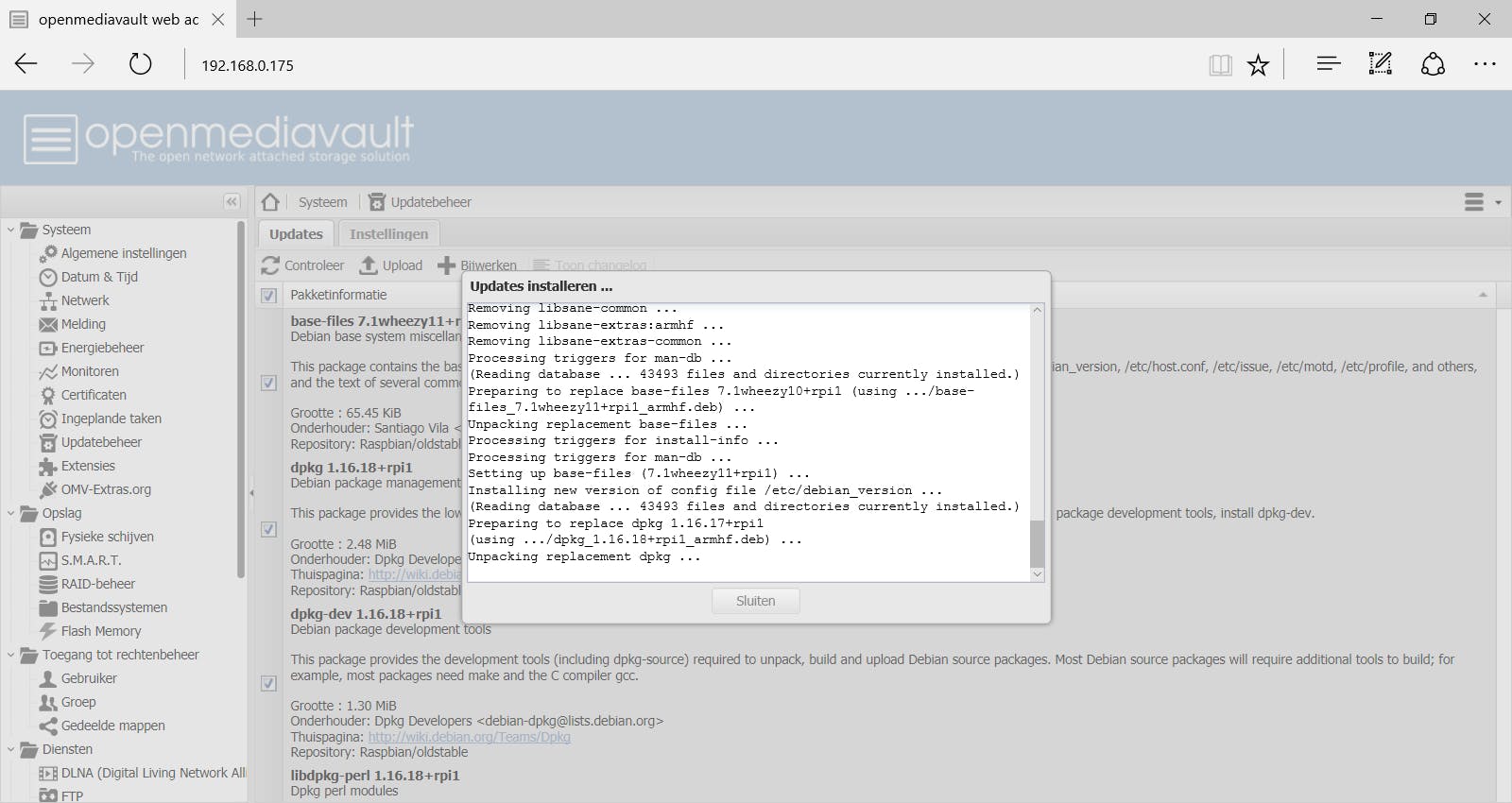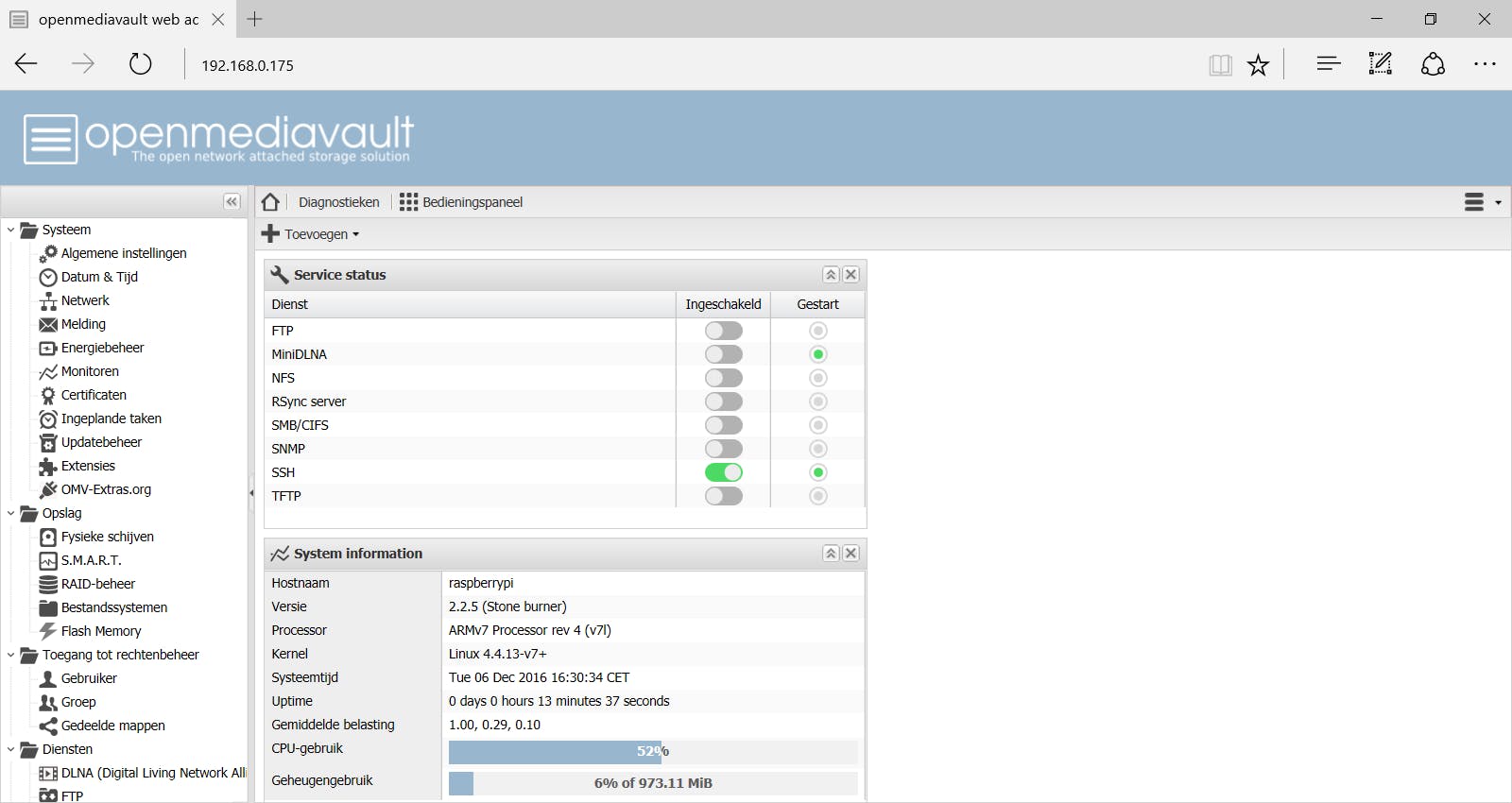Voel je je niet al te beperkt door de lage doorvoersnelheid die je met een Raspberry Pi bereikt, download dan een van de images van OpenMediaVault voor de Raspberry Pi 2 of 3. Op het moment van schrijven was de recentste stabiele versie OpenMediaVault 2.2.5. Let op: de Raspberry Pi 1 wordt niet ondersteund door OpenMediaVault.
