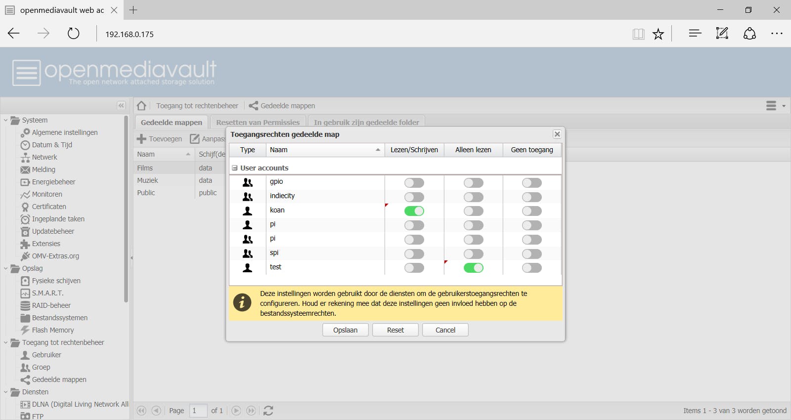 De standaard toegangsrechten zijn goed als je alle gebruikers dezelfde toegang wilt geven. Wil je gebruikers verschillend behandelen, selecteer dan de gedeelde map en klik op Toegangsrechten. Hierin kun je voor alle gedefinieerde gebruikers de standaardpermissies aanpassen. Wil je bijvoorbeeld één gebruiker geen toegang geven tot de map, klik dan in de kolom Geen toegang bij die gebruiker. Klik tot slot op Opslaan.