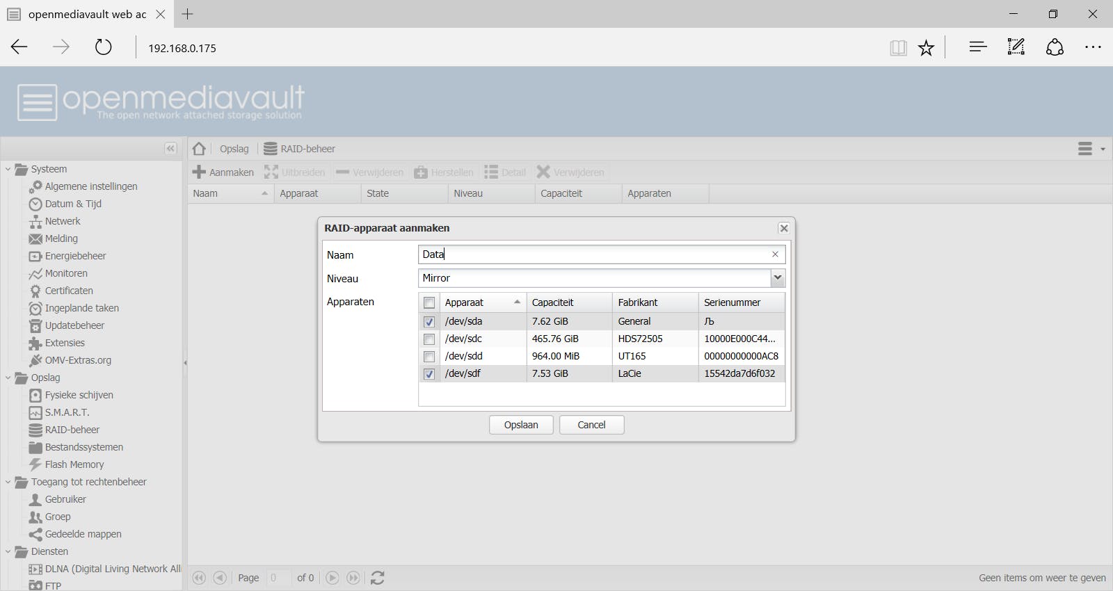 Voor een betrouwbare NAS gebruik je nooit maar één schijf. Als die schijf uitvalt, ben je immers al je bestanden kwijt. Gelukkig ondersteunt OpenMediaVault ook RAID. Voeg daarvoor de schijven toe die je voor RAID wilt inzetten en ga naar Opslag / RAID-beheer. Klik op Aanmaken en geef je RAID-apparaat een naam. Kies het gewenste RAID-niveau en selecteer de schijven die je in je RAID-systeem wilt opnemen. Klik op Opslaan. Wacht nu even tot je RAID-apparaat is geïnitialiseerd. Het is zover als er clean in de kolom State staat. Daarna maak je op het RAID-apparaat een bestandssysteem aan zoals in stap 9.