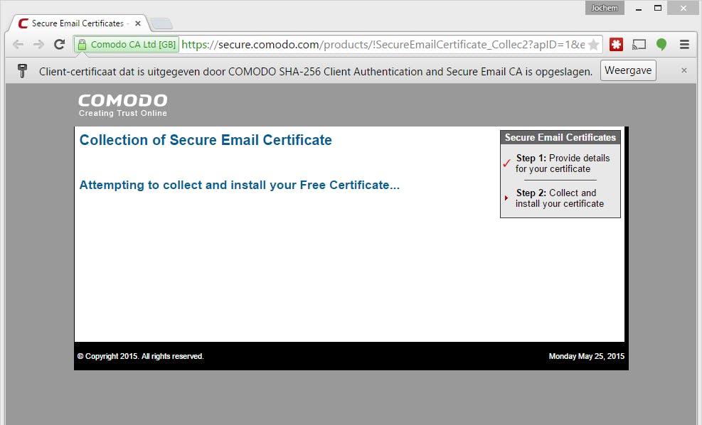 Er wordt nu een privé- en publieke sleutel gegenereerd. Na enige tijd ontvang je een mail waarna je browser de sleutels vrijgeeft. Deze zijn nu geïnstalleerd in je besturingssysteem. Zorg ervoor dat je de link in die mail met dezelfde browser opent als waarmee je net het opzetproces hebt doorloopen. In Internet Explorer kan een melding verschijnen Wilt u deze bewerking toestaan?, die je met Ja kunt bevestigen.