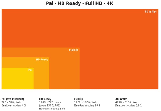 Maar we staan aan vooravond van een nieuwe verschuiving. Bioscoopfilms worden al in de zogenaamde '4K'-resolutie opgenomen, wat circa vier keer Full HD is. Daarmee herhaalt de geschiedenis zich, want alle huidige apparatuur kan daar niet mee overweg. Bovendien worden er verschillende formaten door elkaar heen gebruikt, van QFHD (Quad Full High Definition, 3840 x 2160) tot en met Digital Cinema (4096 x 2160). De resolutie verschilt nog per tv, monitor en videocamera.