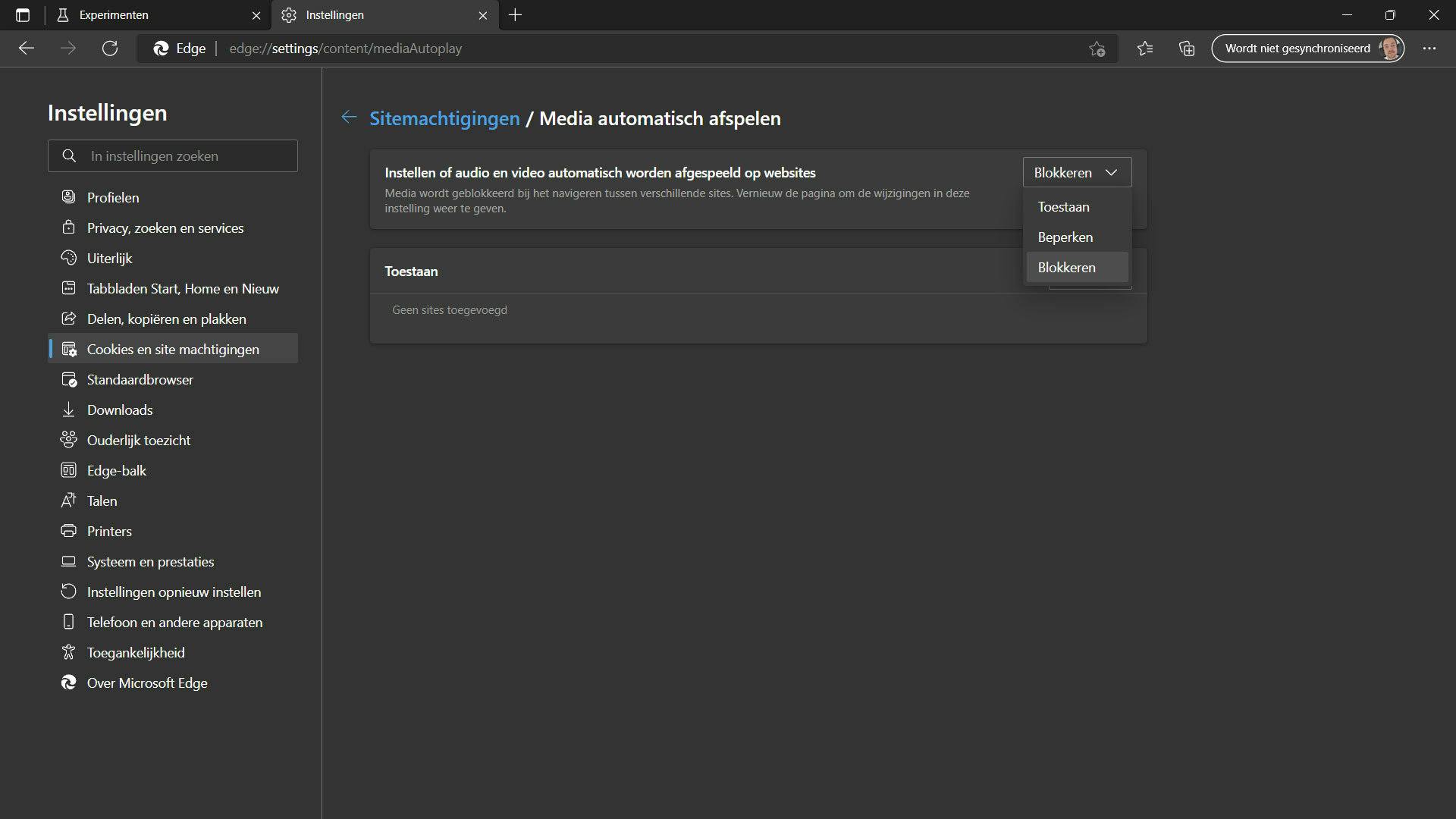 Sluit Microsoft Edge af en start hem opnieuw op. Ga nu naar de Instellingen door rechts eerst op de drie puntjes te klikken en onderaan de optie te selecteren. Kies in het menu links de optie Cookies en sitemachtigingen en zoek Media automatisch afspelen op. Je kunt ook de volgende regel kopiëren en plakken in de balk bovenin, dan kom je direct op de juiste pagina terecht: edge://settings/content/mediaAutoplay.