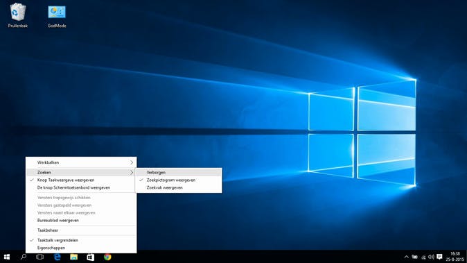 Vind je die zoekfunctionaliteit overbodig (omdat het grotendeels ook via de startknop kan en via de zoekmachine in je browser)? Dan kun je hem ook eenvoudig verwijderen. Druk met de rechtermuisknop op het vergrootglas-icoontje, ga naar Zoeken en druk op Verborgen. Vanaf nu is het vergrootglas van je taakbalk verdwenen. Door op Knop taakweergave weergeven te drukken, verwijder je de snelkoppeling naar de virtuele bureaubladen.