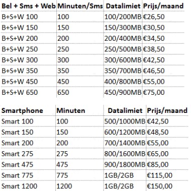 Op dit moment kent de goedkoopste variant van die bundel nog een limiet van 250MB terwijl alle andere varianten een limiet van 1GB hebben. In de nieuwe opzet krijgen klanten met dit abonnement bij het goedkoopste abonnement 100MB limiet en loopt dit met 50MB omhoog tot maximaal 450MB. Wel is het mogelijk om het dataverkeer gratis te verdubbelen. Voor 2,50 euro is het mogelijk om 100MB extra data in te kopen.