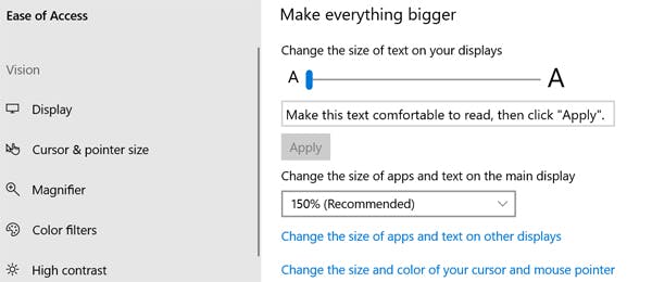 Zijn teksten in Windows 10 te klein? Dan heb je al opties om lettergroottes te schalen (naar bijvoorbeeld 150 procent) of om de resolutie te verlagen. Beide zijn niet perfecte oplossingen, maar de 'Maak alles groter'-functie moet dat wel zijn. Letters worden dan groter binnen alle apps en menu's van Windows 10, waaronder in mappen en het startmenu.