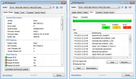 Als u meer dan één optisch loopwerk hebt, kunt u uw branders selecteren uit het drop-downmenu Spelers. De resultaten verschijnen in het tabblad Speler opties. Maar VSO Inspector kan nog meer. Plaats een cd, dvd of ander schijfje en open het tabblad Media. Achter Media id staat nu de identificatie van het schijfje, bijvoorbeeld MBI 01RG40. Hiermee kunt u via Google meer informatie zoeken over de herkomst van de disk. Bij Content vindt u technische informatie over de manier waarop het schijfje is gebrand. VSO Inspector helpt ook bij het onderzoeken van een mogelijk defecte disk. Klik hiervoor op Start in het tabblad Scan. Afhankelijk van de staat van het schijfje en de inhoud kan dit proces lang tot zeer lang duren. Na afloop geeft VSO Inspector zowel de foutloze leesacties als problemen en storingen aan.
