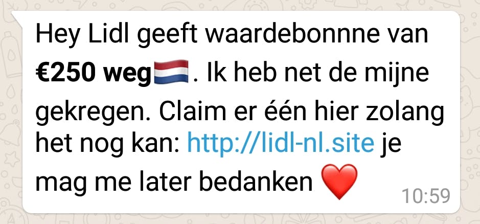 Het probleem is echter de inbox ontgroeit. Phishing zit niet vast aan je e-mail. Zo waarschuwde supermarktketen Lidl vorig jaar nog voor een bericht dat verspreid werd via WhatsApp. Een linkje werd doorgestuurd naar een site waarop je je kon aanmelden voor een waardebon van 250 euro. Natuurlijk was dit niet echt, maar een manier om gegevens zoals e-mailadressen buit te maken, die bijvoorbeeld misbruikt kunnen worden voor spam. Dit soort phishingacties komen ook voor op andere sociale media, zoals Facebook.