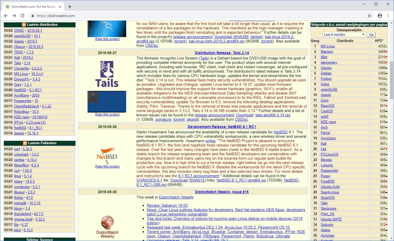 De website DistroWatch is een handige plek om distributies met elkaar te vergelijken. Voor elke distributie zijn er uitgebreide details te vinden. Bijvoorbeeld wat de basis voor de distributie is, welke releases er zijn geweest, hoe actueel de software is en wat gebruikers ervan vinden, met uitgebreide reviews. Ook kun je zien wat de populairste distributies zijn. Op dit moment bestaat de top vijf uit MX Linux, Manjaro, Mint, elementary OS en Ubuntu. Hierbij kijkt de website puur naar het aantal paginaraadplegingen; meer dan een indicatie is het daarom niet. Bedenk dat distributies komen en gaan. Er zijn dus altijd veel verschuivingen, maar dat houdt het ook levend.