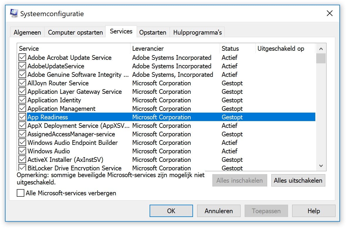Het nadeel is dat je in dit overzicht niet alle Windows-diensten kunt verbergen, en elke dienst apart moet uitschakelen.