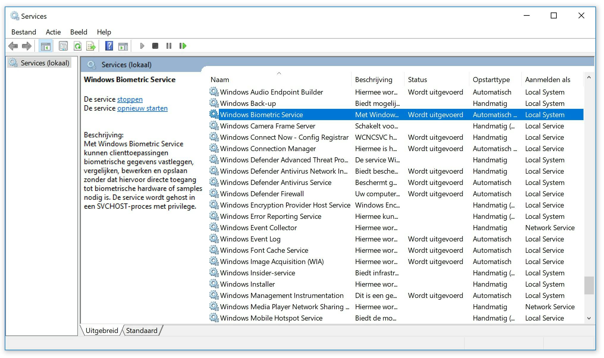 Windows Biometric Service: Deze dienst slaat biometrische gegevens op, zoals bijvoorbeeld je vingerafdruk. De Windows Hello functie maakt hier echter ook gebruik van, dus ook al heb je geen vingerafdrukscanner, dan nog kan het handig zijn om de dienst gewoon ingeschakeld te laten.