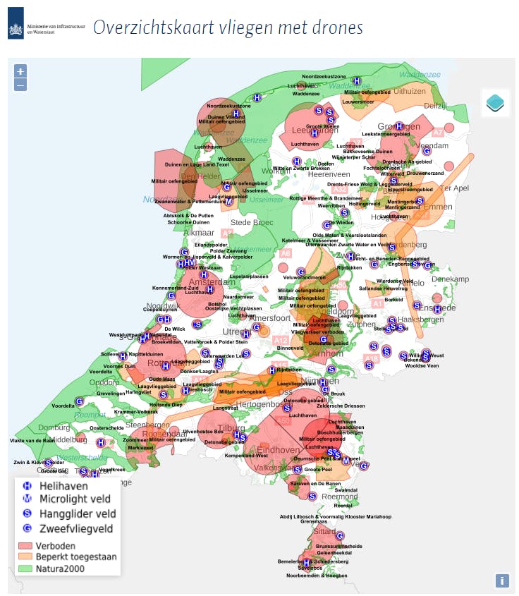 Let ook goed op de no-flyzones als je in de buurt van bijvoorbeeld een vliegveld bent. Je moet minimaal drie kilometer verwijderd blijven van zulke gebieden. Gelukkig bestaat er een online kaart waarop de verboden gebieden zijn aangegeven. De kaart geeft verschillende regio’s aan: verboden, beperkt toegestaan en natuurgebieden. Realiseer je ook dat drones altijd voorrang moeten verlenen aan de andere gebruikers van het luchtruim: denk aan helikopters en luchtballonnen.