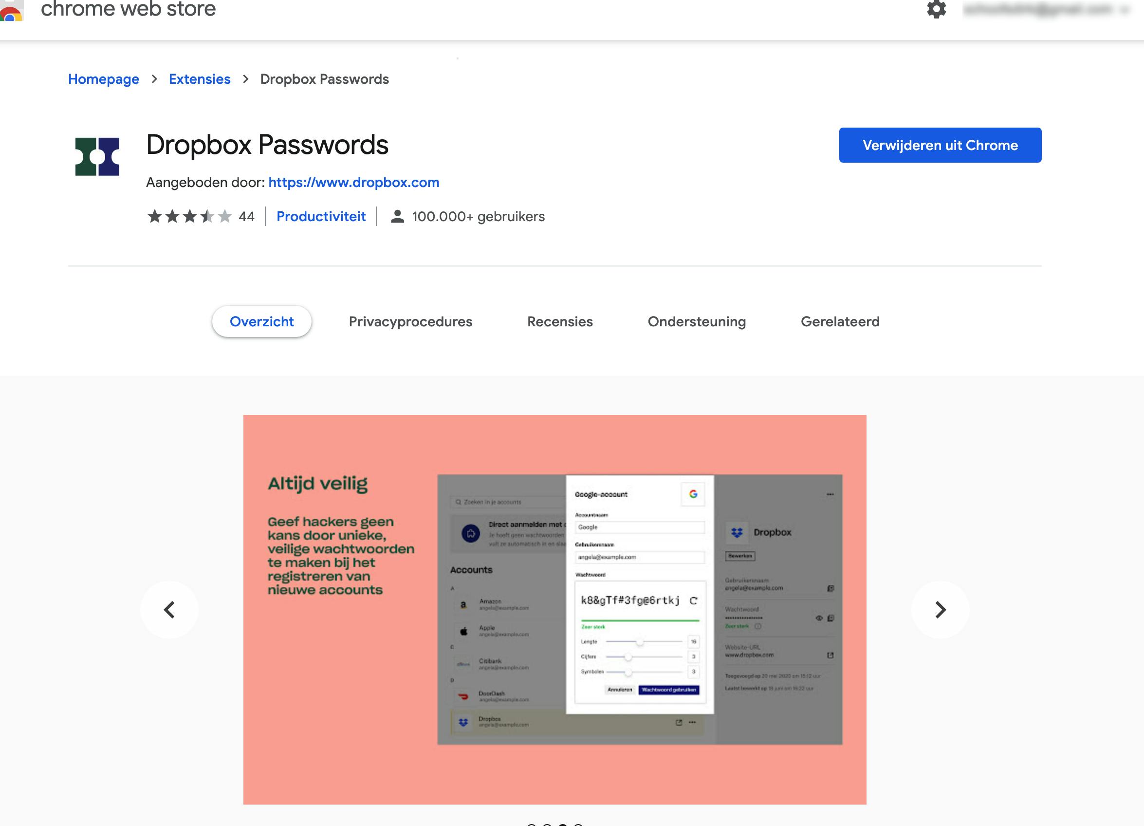 Als we dit schrijven bestaat de wachtwoordmanager Dropbox Password als desktop-app nog steeds, maar de functionaliteit van dit standalone programma wordt wel afgebouwd en de ondersteuning verdwijnt zelfs dit jaar. In plaats daarvan is er de gelijknamige nieuwe browserextensie voor Firefox, Google Chrome, Microsoft Edge en Safari. Er is ook een mobiele versie voor Android, iPhone en iPad.