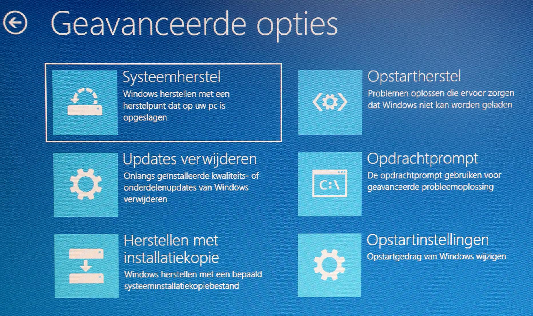 De meeste computers die de afgelopen vier jaar over de toonbank zijn gegaan, starten zo snel op dat ze niet meer luisteren naar deze toetsen. Dan moet je de volgende stappen volgen. Ga via de Start-knop naar Instellingen en klik op de optie Bijwerken en beveiliging. In dit venster klik je in het linkermenu op Systeemherstel. Klik onder het kopje Geavanceerde opstartopties op de knop Nu opnieuw opstarten. Hierdoor start Windows opnieuw op in een blauw scherm en bovenaan lees je de tekst Kies een optie. Gebruik de knop Problemen oplossen en klik op Geavanceerde opties. Klik op Instellingen voor UEFI-firmware en daarna op Opnieuw opstarten. Windows start hierdoor opnieuw op, maar ditmaal beland je in de uefi-instellingen van je computer.