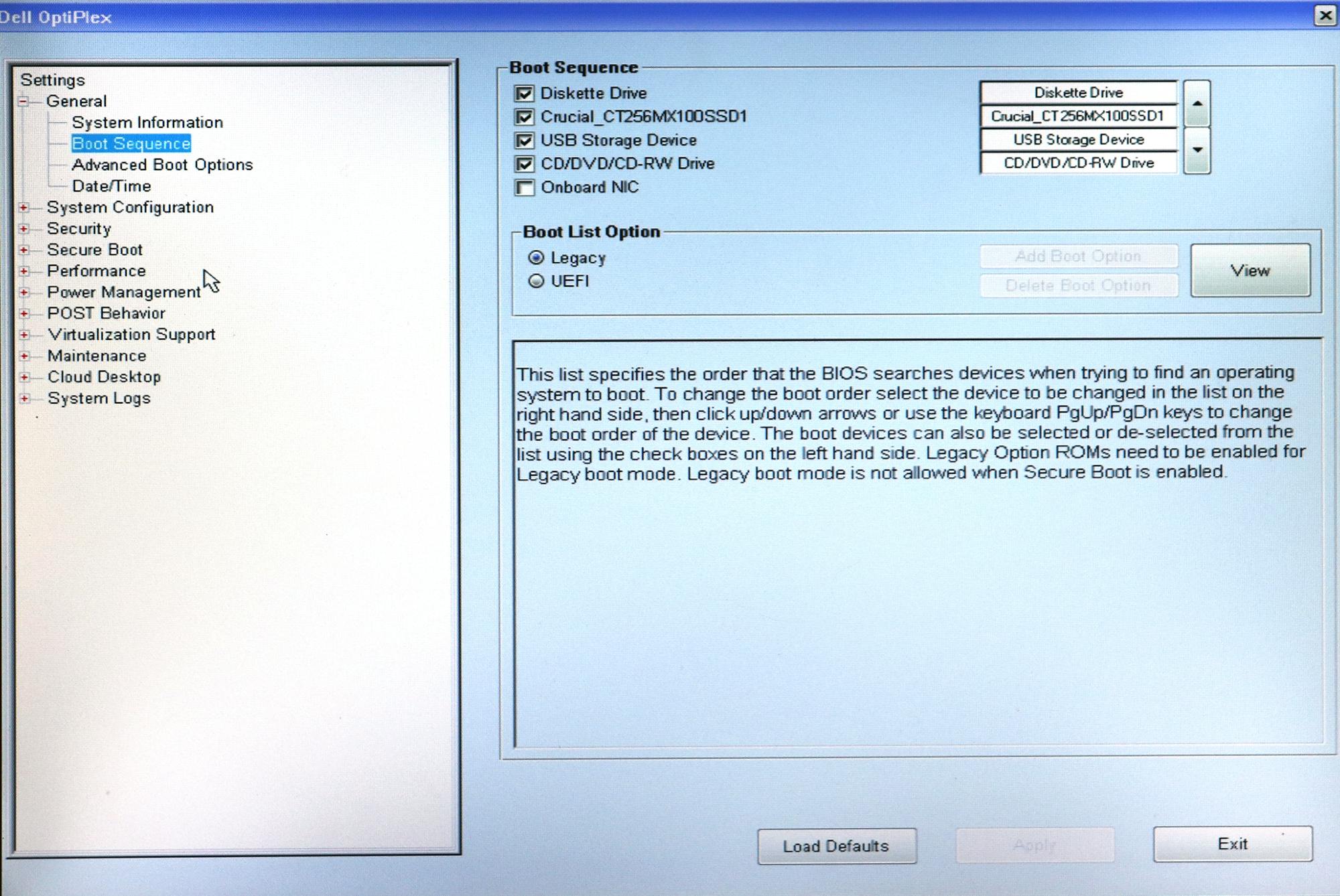 Wil je opstarten van een dvd of wil je een besturingssysteem van een usb-stick inladen, dan moet je zorgen dat het bios of de uefi eerst de bootloader van de usb-stick of dvd leest, voordat hij die van Windows op de harde schijf aanspreekt. Ga naar het tabblad Boot en zoek een functie die Boot Priority of Boot Sequence heet. Hier zie je een lijstje waarin de aangesloten harde schijf, een cd/dvd-rom en een usb-station vermeld is. Gebruik de pijltjestoetsen of de plus- en mintoetsen om de volgorde te wijzigen. Het is mogelijk dat je de optie Secure Boot moet instellen op Disabled. Ga naar Exit (afsluiten) en Exit Saving Changes (wijzigingen opslaan bij het afsluiten) en start opnieuw op.