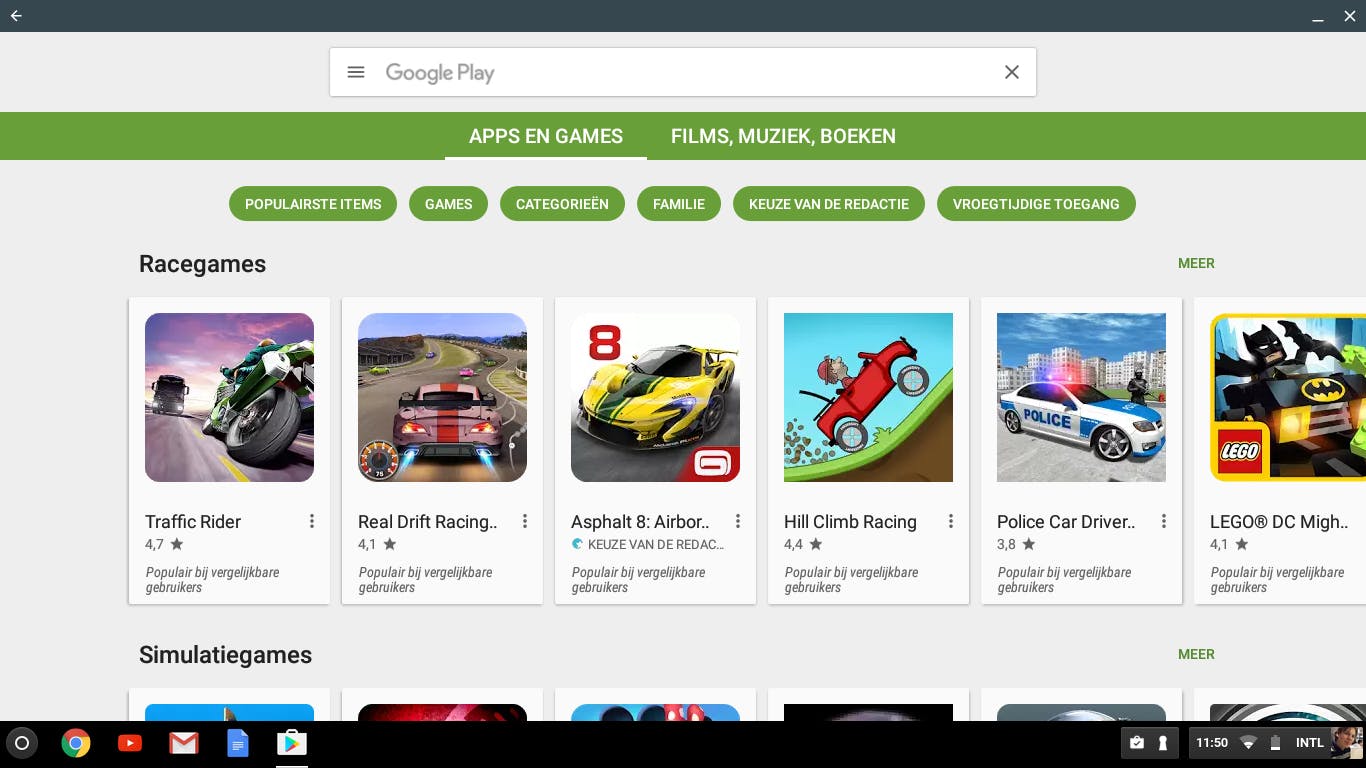Naast Chrome OS heeft Google met Android nog een eigen besturingssysteem. Android heeft als grote voordeel dat er veel apps waaronder spelletjes beschikbaar zijn, die je lokaal zonder internet kunt gebruiken. Misschien dat Google daarom begonnen is om Android binnen Chrome OS te laten draaien. De eerste Chromebooks waarop dat kan zijn Googles eigen Chromebook Pixel, Acers Chromebook R 11 en ASUS’ Chromebook Flip. Niet toevalligerwijs Chromebooks met een aanraakscherm. In 2017 staan ook andere Chromebooks op de lijst om Android te krijgen, de lijst vind je hier. Daar staan ook modellen zonder aanraakscherm tussen, alle modellen in deze test staan op de lijst. Het gaat op het moment van schrijven om Android 6.0.1. Android-apps staan na installatie in het menu tussen de normale Chrome OS-webapps. Android-apps draaien in het volledige scherm, het is niet mogelijk om het venster kleiner te slepen. Vrijwel alle Android-apps vind je terug in de Android Play Store. Jammer is wel dat Microsoft op het moment van testen besloot om de gratis Microsoft Office-tabletapps terug te trekken op de Chromebooks. Deze bleken namelijk prima geschikt om bijvoorbeeld Word offline te gebruiken. Naast optimalisatie is een andere reden van de terugtrekking dat de doorsnee Chromebooks een scherm van 11,6 inch of groter heeft. Microsoft wil op apparaten met een scherm groter dan 10,1 inch dat je een Office 365-abonnement afsluit en dat werkte nog niet op de Chromebooks. De apps zullen wel weer terugkeren in de Android-store op Chromebooks en vereisen dan op de meeste Chromebooks een abonnement.