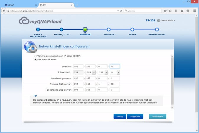 01 Het is belangrijk dat je je NAS tijdens de installatie een vast IP-adres geeft zodat je hem altijd kunt bereiken.