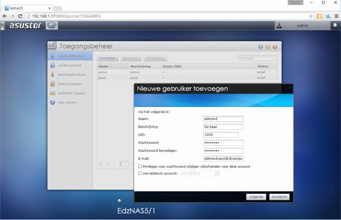 De NAS beheer je via de webinterface. Start daarom de browser en typ in de adresbalk het IP-adres van de NAS. Login als admin met het sterke wachtwoord dat je tijdens de installatie hebt ingesteld. Ga dan naar het hoofdonderdeel van de NAS en selecteer iets als Gebruikers of Toegangsbeheer (de exacte naam verschilt per fabrikant). Klik op Nieuw of Toevoegen om een nieuwe gebruiker aan te maken. Maak andere gebruikers dan jezelf in elk geval geen lid van de admin-groep en maak het liefst voor jezelf ook een account dat geen admin is.