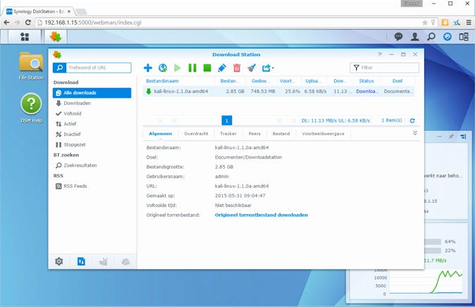 Kopieer hiervoor de url van de torrent of bewaar het torrent-bestand op de pc en open het dan met de downloadfunctie. Voeg de taak toe en even later begint de NAS te downloaden. Je kunt nu de browser sluiten en de pc uitschakelen, de download wordt verder door de NAS afgehandeld. Je kunt rustig meerdere downloads toevoegen, de NAS regelt het allemaal. Behalve torrents worden ook ftp- en http-downloads ondersteund.