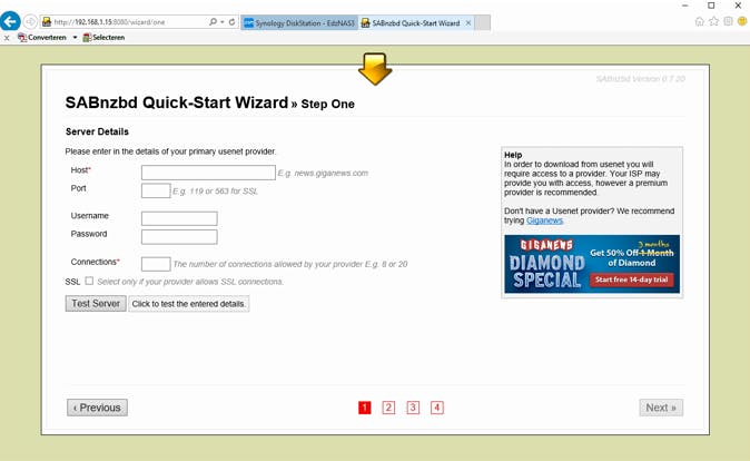 Download je uit de binary-nieuwsgroepen op een nieuwsserver, installeer dan SABnzbd op de NAS. Ga naar de instellingen en configureer daar de juiste newsserver, plus de gebruikersnaam en wachtwoord die daarbij horen. Stel ook andere zaken in zoals het maximaal aantal gelijktijdige connections (verbindingen) of SSL om de verbinding te beveiligen.
