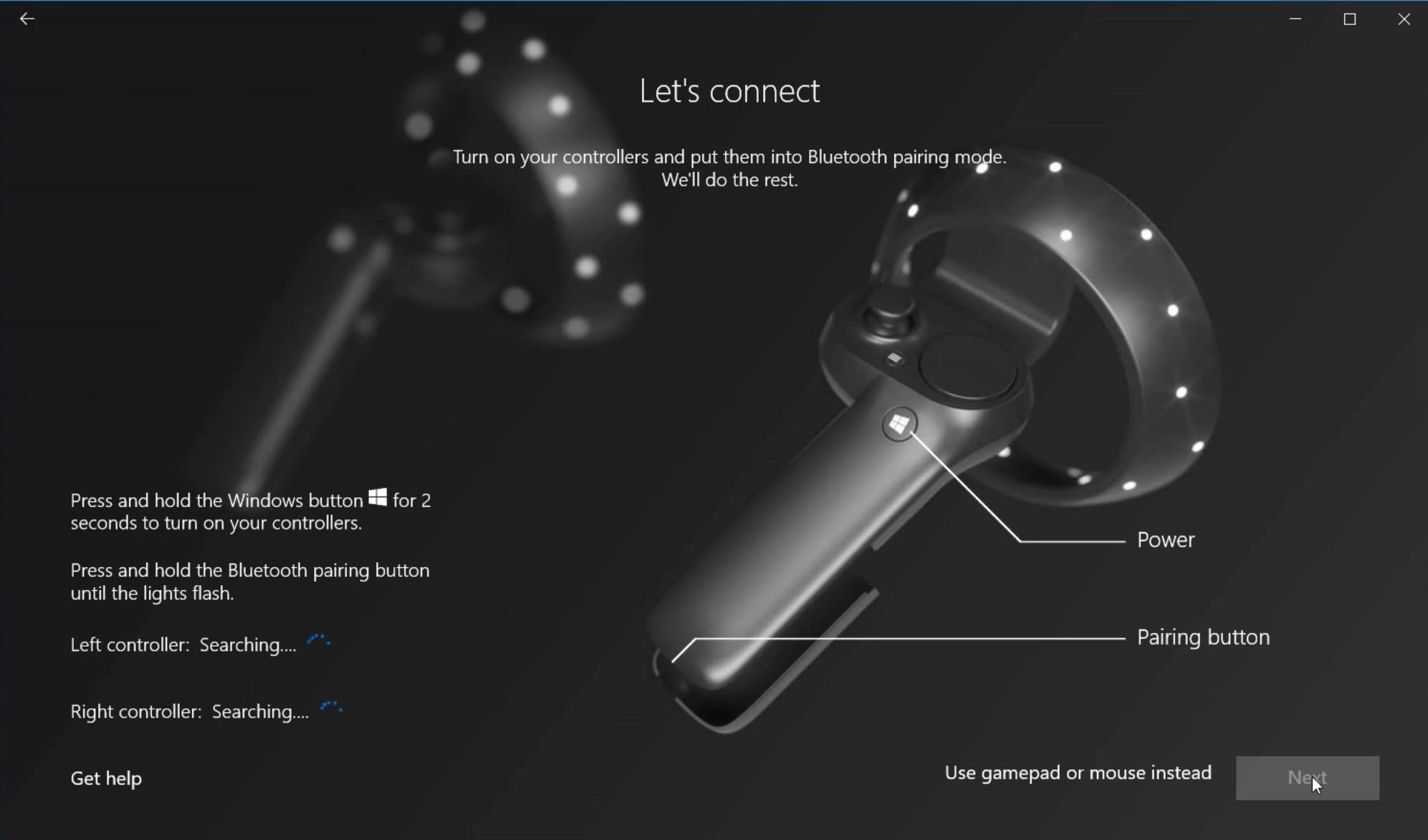 Klik op Aan de slag en bij de gebruiksvoorwaarden op Ik ga akkoord. In het volgende venster klik je op Volgende om de installatieprocedure van de headset en eventueel de controllers te starten. Na nog enkele keren op Volgende te hebben geklikt, ben je een beetje bekend met de knoppen op de controllers en gaat je pc naar het bluetooth-signaal ervan op zoek. Houd de Windows-toets twee seconden ingedrukt om ze aan te zetten. Daarna haal je het batterijklepje los om een koppel-knopje te vinden. Houd die ingedrukt tot de led-lampjes op de controller gaan knipperen. Wanneer beide controllers zijn ingesteld, druk je wederom op Volgende.