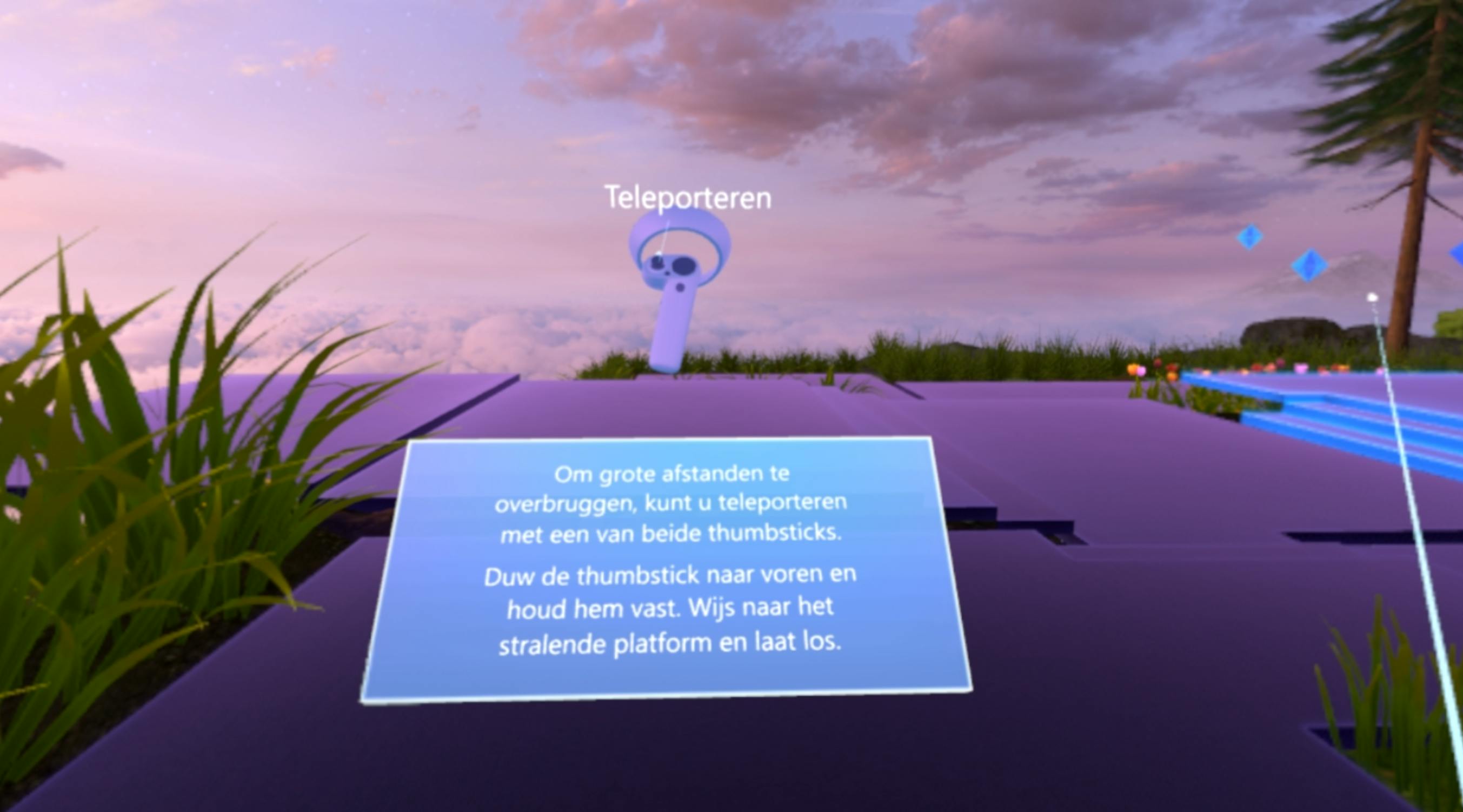 Je komt terecht in een virtuele omgeving waarin je met name leert hoe de controllers werken. Dit is namelijk niet zo vanzelfsprekend als je zou denken, maar wordt vanzelf tweede natuur. Je beweegt aan de hand van teleportatie. Dat wil zeggen: je richt de stick naar de plek waar je heen wilt. Laat je de stick los, dan sta je daar meteen. Vrij bewegen zit er niet in, met goede reden. Deze manier van ‘rondlopen’ is verzonnen om bewegingsziekte tegen te gaan. Volg de Nederlandstalige aanwijzingen op het scherm om te leren hoe je in virtual reality met de controllers kunt wijzen en menu’s kunt bedienen. Een kind kan de was doen!