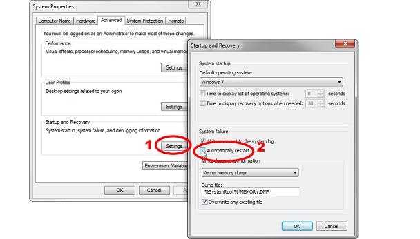 Klik op het tabblad Advanced, en klik op de Settings-knop onder Startup and Recovery (in plaats op de twee andere Settings knoppen van het dialoogvenster). Haal het vinkje bij Automatically restart weg.