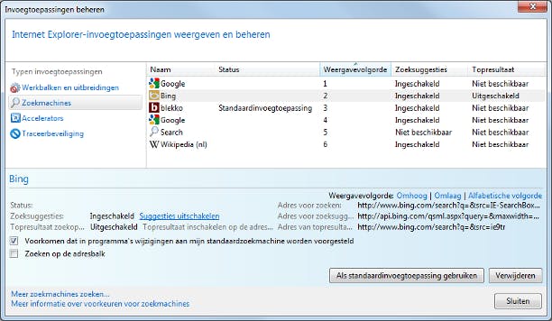 U kunt de functie ook uitschakelen. Druk op de knop Extra en kies Invoegtoepassingen beheren. Klik in het linkerpaneel op Zoekmachines en selecteer de zoekmachine (Bing, bijvoorbeeld). Onderaan klikt u bij Zoeksuggesties op Suggesties uitschakelen. Wilt u vermijden dat een term die u hebt ingetikt ook na het indrukken van de Enter-toets naar de zoekmachine gaat, verwijder hier dan het vinkje bij Zoeken op de adresbalk. We geven nog even mee dat de instructies voor deze procedure zoals beschreven in de 'Privacyverklaring voor Windows Internet Explorer 9', niet correct zijn. Een vergetelheid van Microsoft?
