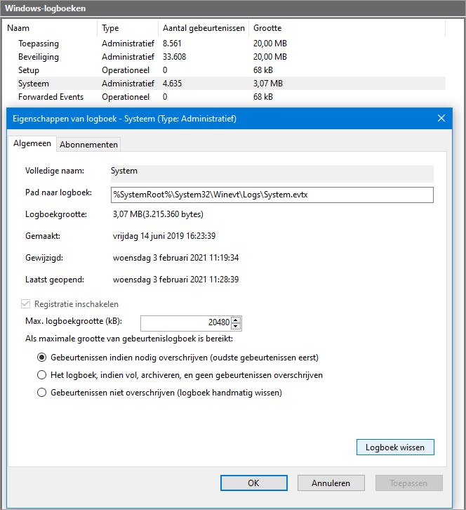 Via de optie Eigenschappen in het contextmenu van zo’n item kun je het pad en de maximale logboekgrootte instellen. Je legt hier tevens vast wat er hoort te gebeuren als het plafond is bereikt. Met Logboek wissen verwijder je een logboek, waarbij je wel nog de kans krijgt het eerst te bewaren in een evtx-bestand, dat je dan na een dubbelklik terugvindt in het linkerdeelvenster bij Opgeslagen logboeken.