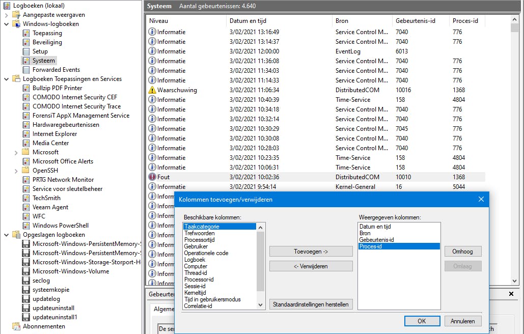 Er zijn nog andere criteria mogelijk. Klik met rechts op een kolomtitel en kies Kolommen toevoegen/verwijderen om ook andere items te selecteren. Zo kan Proces-id nuttig zijn in combinatie met de informatie die je krijgt in Windows Taakbeheer (druk op Ctrl+Shift+Esc), in de kolom PID (en Opdrachtregel).