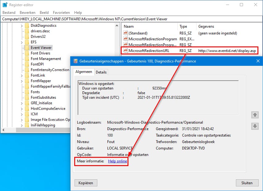 Soms kun je al uit de beschrijving, in combinatie met de symptomen afleiden wat precies het probleem veroorzaakt. De Microsoft-link Help online op het tabblad Algemeen geeft helaas zelden bruikbare informatie en kun je beter vervangen door een link naar de service van EventID.Net, met de bron en ID als zoekparameters. Druk hiervoor op Windows-toets+R en voer regedit uit.