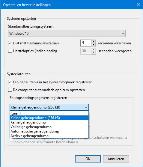 Eventueel kies je voor een Automatische geheugendump of een Kernelgeheugendump (beide bevatten alleen geheugenpagina’s in kernelmodus – niet die in usermodus). Wil je absoluut ook usermodus-processen, die doorgaans niet verantwoordelijk zijn voor BSoD’s, dan kies je Actieve geheugendump of zelfs Volledige geheugendump.