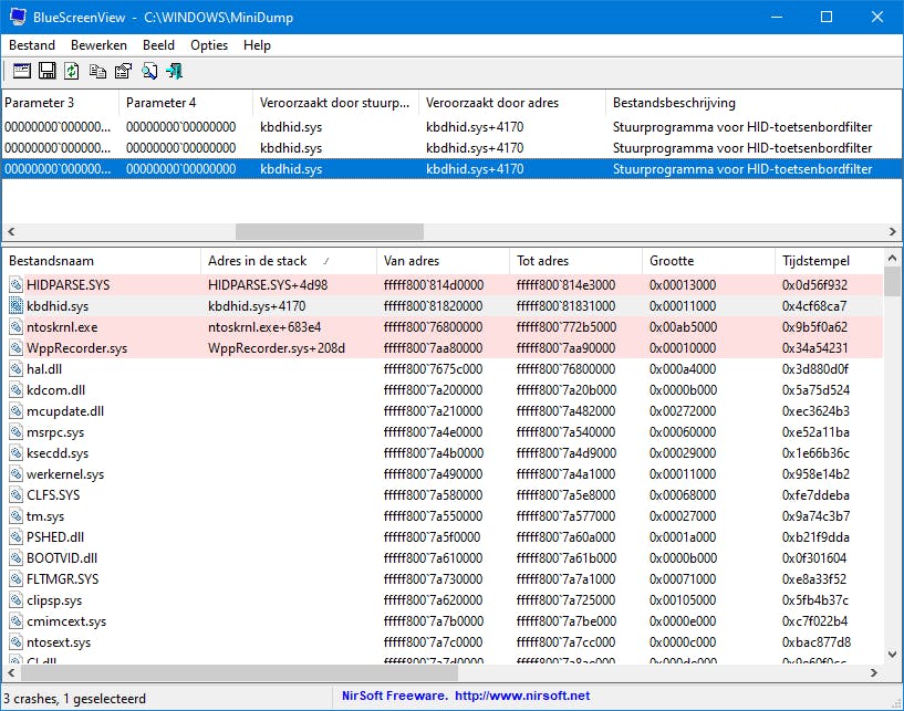 In het bovenste venster lees je onder meer de crashtijd af, het stuurprogramma met bestandsbeschrijving dat vermoedelijk de crash veroorzaakte, evenals het stackadres. In het onderste venster krijg je een vollediger overzicht van de drivers die toen waren geladen, en de drivers die vermoedelijk aan de crash gelinkt zijn heeft BlueScreenView met rood gemarkeerd.